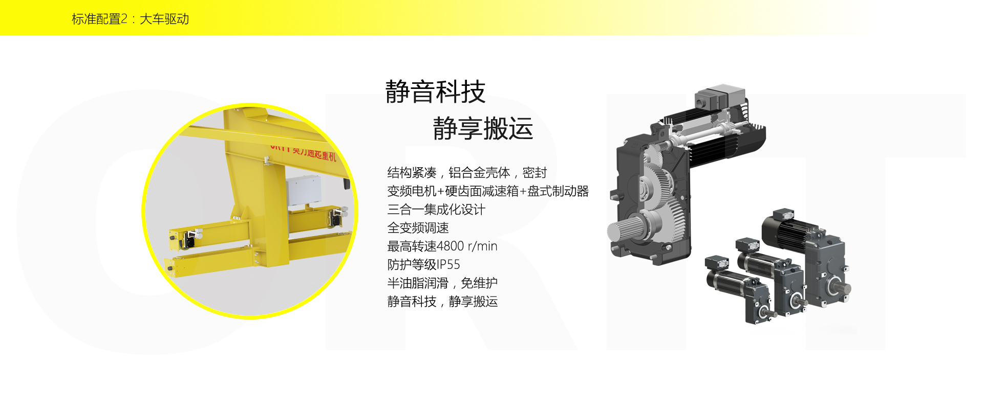 產品名稱:壁行式起重機 多層車間的最佳選擇 優化設計,結構緊湊 變頻控制,運行平穩 實時安全監控,確保吊運安全 占用空間小,工作面積大 集高強度低架構與一體,達到最大的提升設計 適用于5t以下額定載荷平穩、快速地起吊搬運。 標準配置1:起升機構 顛覆傳統,自成一體 低凈空設計 柔性驅動,內應力小,傳動效率高 重級制電機,接電持續率60%ED 行走變頻無極調速,運行平穩 自調試電磁盤式制動器,可靠,防塵 2160N/mm2 高強度鍍鋅鋼絲繩,免維護 全周型導繩器,防松繩 全系標配安全監控系統 標準配置2:三合一驅動 靜音科技,靜享搬運 結構緊湊,鋁合金殼體,密封 變頻電機+硬齒面減速箱+盤式制動器 龍門專用C型三合一集成化設計,節約空間 全變頻調速 最高轉速4800 r/min 防護等級IP55 半油脂潤滑,免維護 靜音科技,靜享搬運 標準配置3:電控系統 安全隨心掌控 智能安全監控器 計算起升機構剩余安全工作時間 累計起升工作時間 累計超載次數 累計起升電機啟動次數 起升電機過熱保護及報警 剎車片厚度報警 ... ... 遠程通訊 施耐德電氣元件 航空插座接口 IP55防護等級 標準配置4:端梁 多變靈活,適應自如 模塊化直驅設計 自重輕、體積小 QT700車輪,自潤滑,更靜音 采用調心軸承,適應更自如 雙輪緣端梁與平輪端梁完美結合, 既滿足受力要求, 又徹底的解決了三條端梁(軌道)可能產生的啃軌問題。 應用